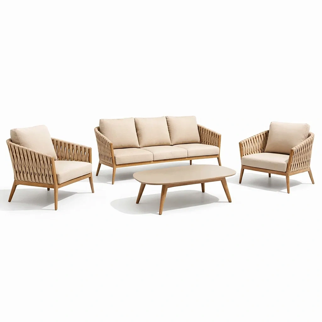 Sofa-set holzoptik beige mit textilgeflecht