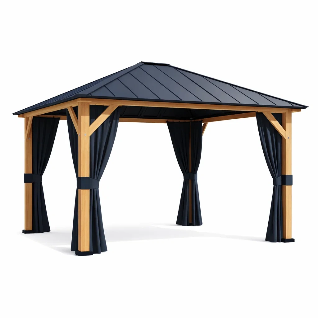 Material: Dach aus galvanisiertem Stahl, Gestell aus massivem Holz, Vorhänge aus Polyester