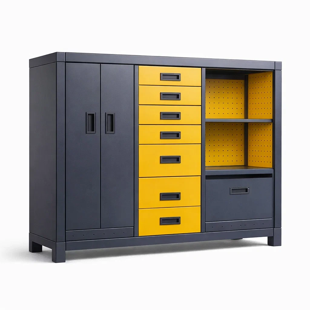 Konstruktion: 2 Türen, 6 Schubladen, 2 offene Regale